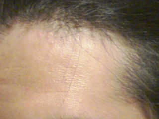 おでこの生え際からの発毛画像です。モサモサと短い髪が発毛を始めて伸びてきました。やっと少し安心できました。ミノタブの副作用での初期脱毛状態から抜け出し、この3日程前から完全に抜け毛もストップしました。